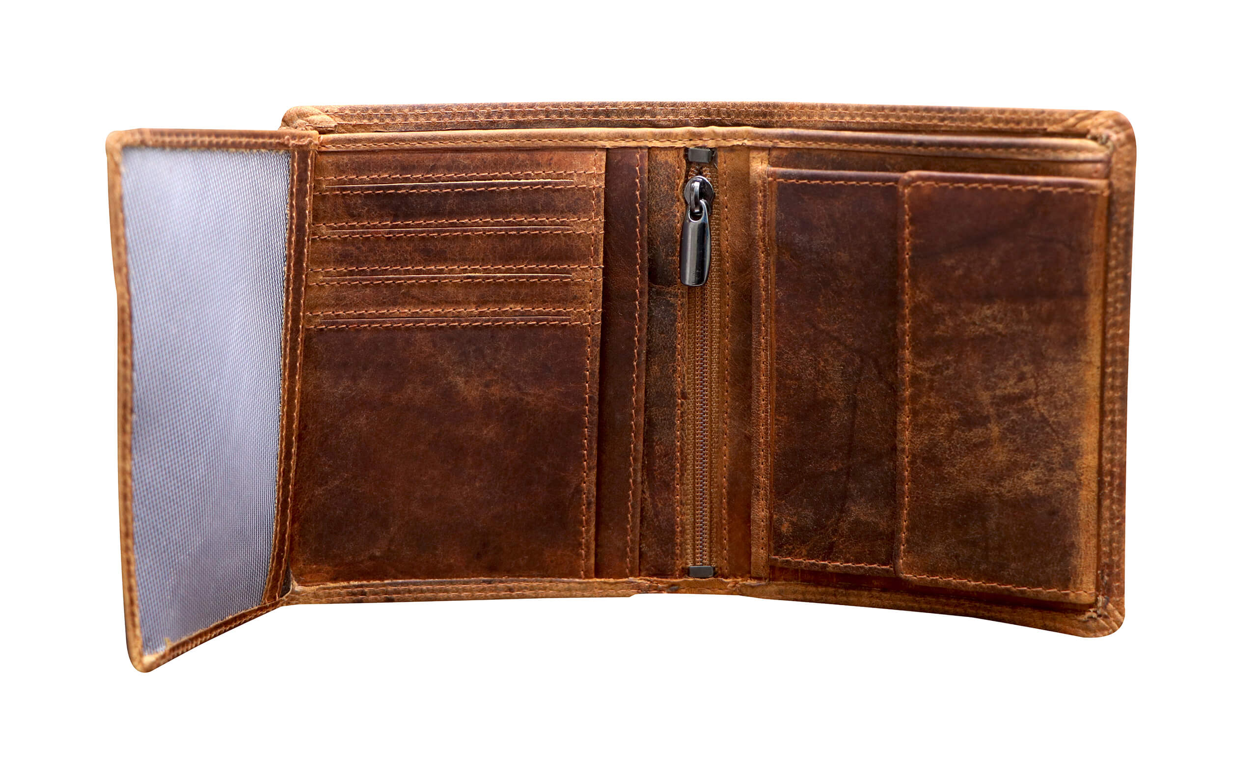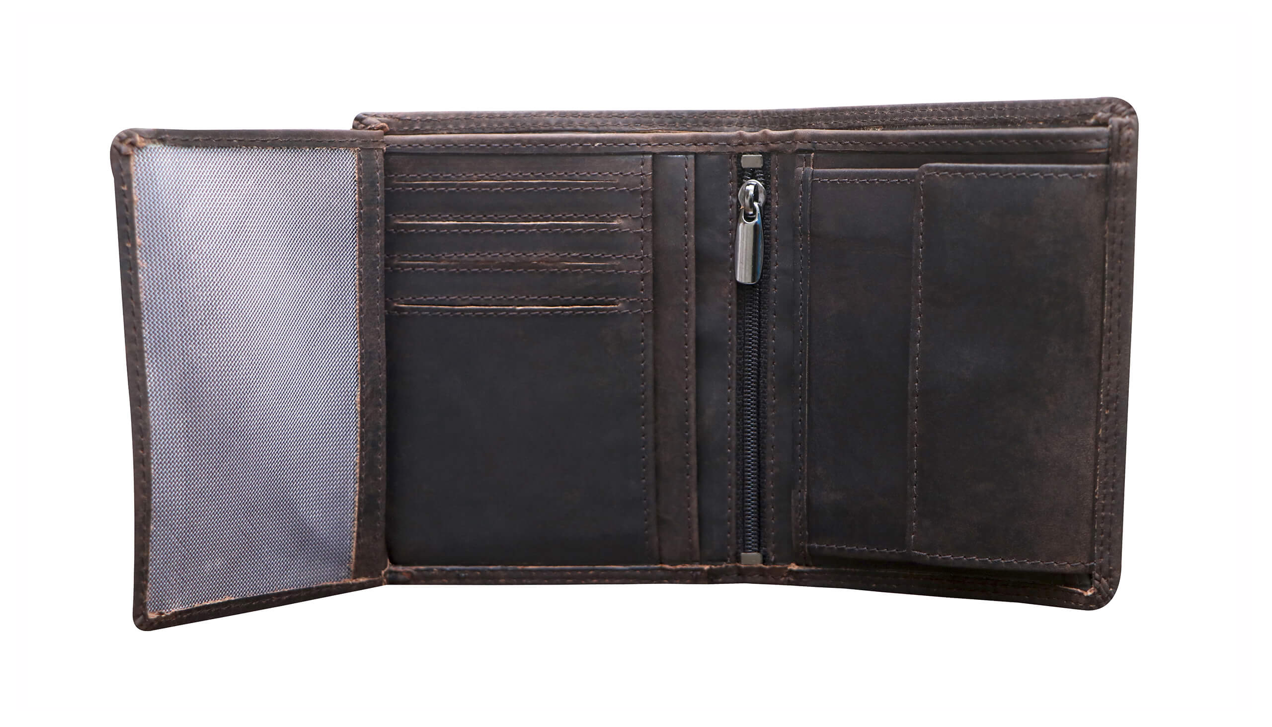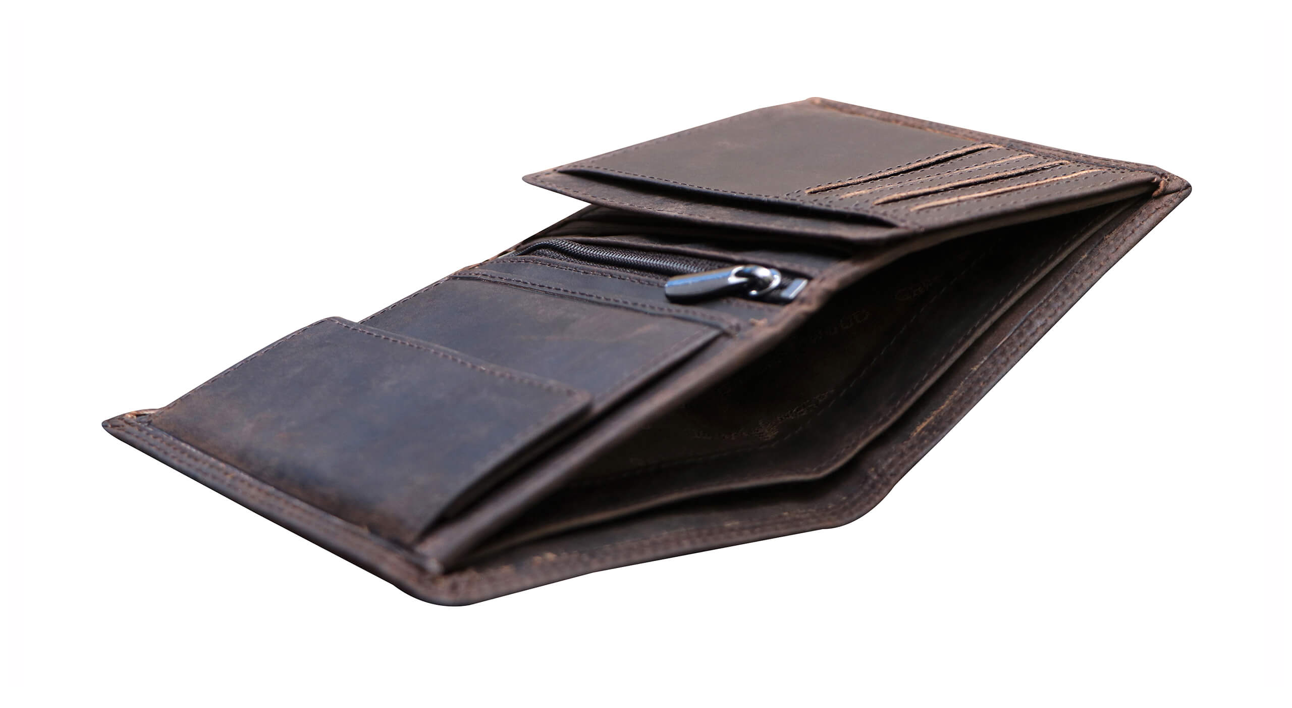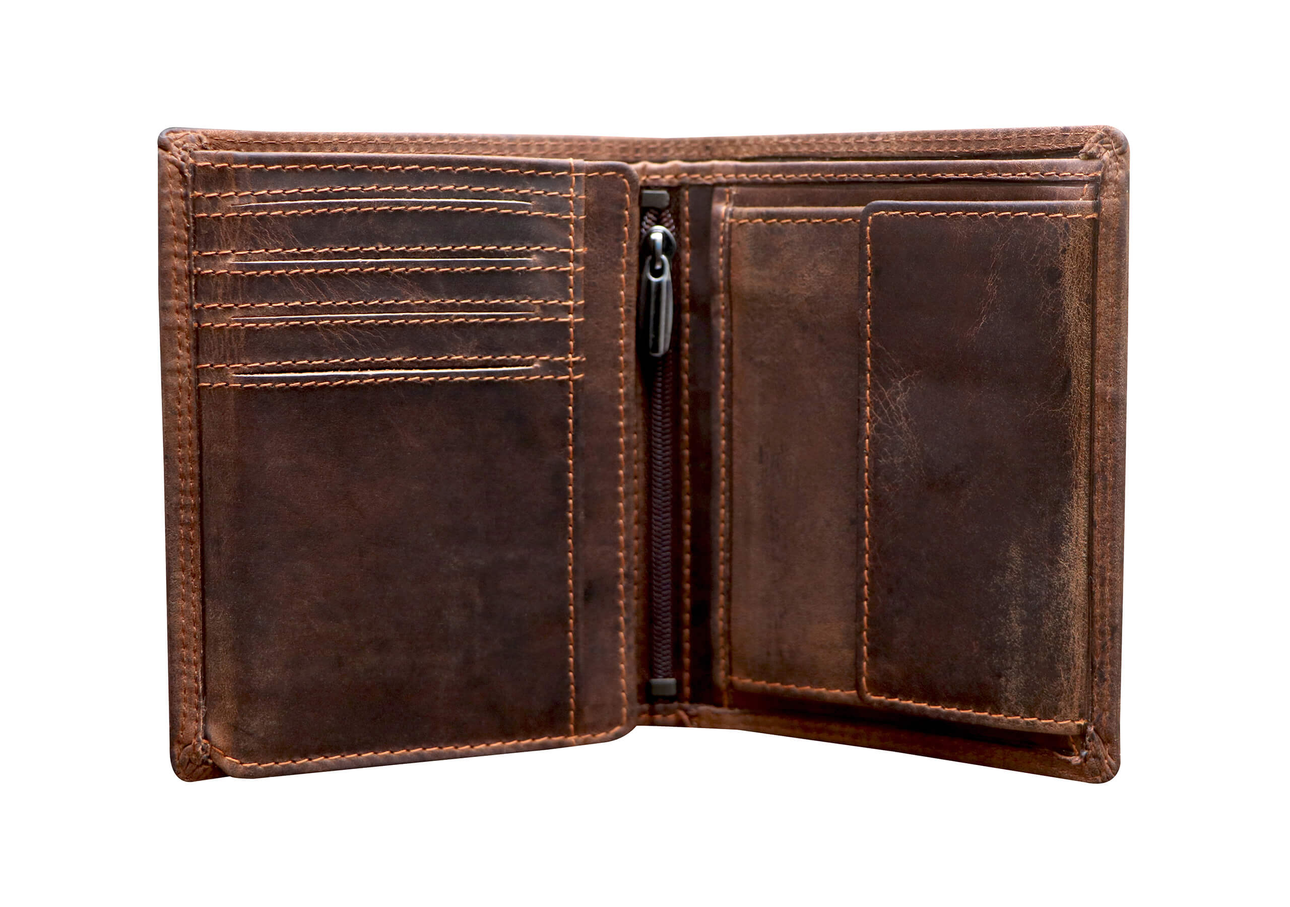 Tim is a simple retro-style portrait format wallet designed especially for men. It is lightweight, slim, and easy to carry. With thirteen card slots, a coin pocket, a zippered compartment, and two bill compartments, it offers ample space. Additionally, RFID technology protects your credit cards from unauthorized card readers. Thanks to its compact design, the billfold wallet fits easily into any shirt or trouser pocket and is hardly noticeable under clothing. The minimalist look and waxed genuine leather make it particularly popular among men.
