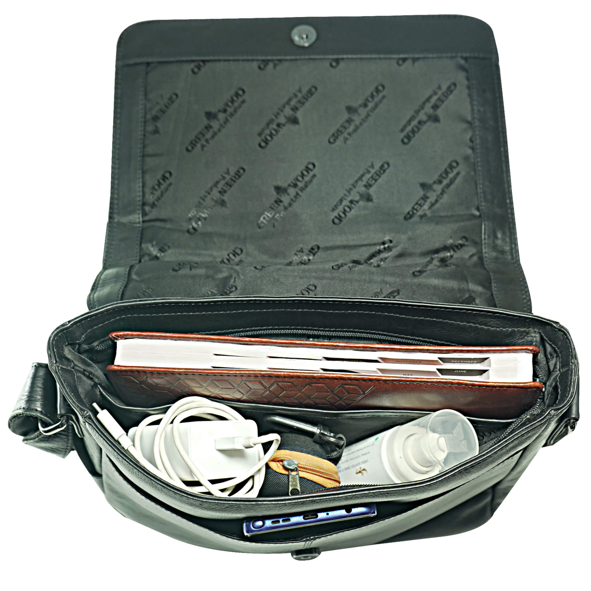 - Embossed Greenwood logo on the outside, sewn-on label in the main compartment, bright decorative seams, color-coordinated inner lining and smooth-running zippers.