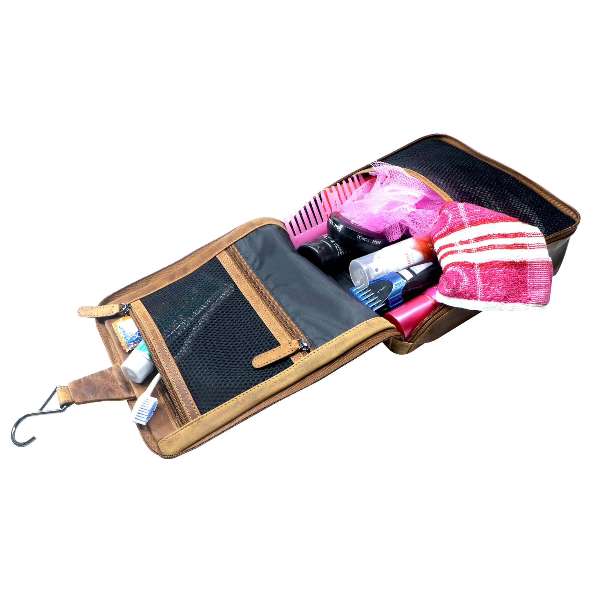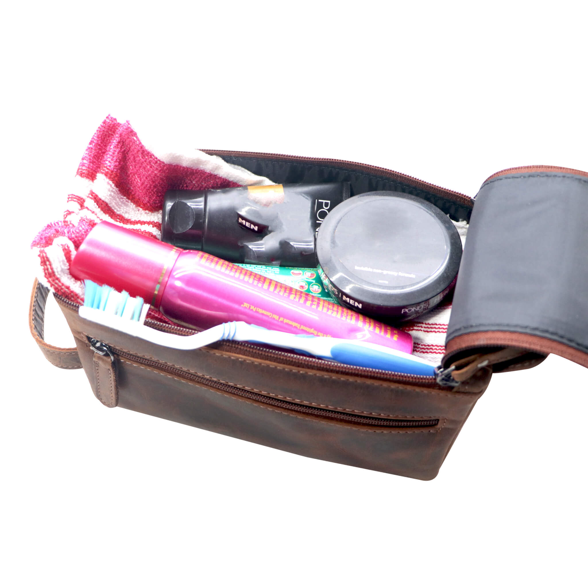 Collection of leather toiletry bags and cosmetic bags: stylish, vintage-style accessories for your travels.