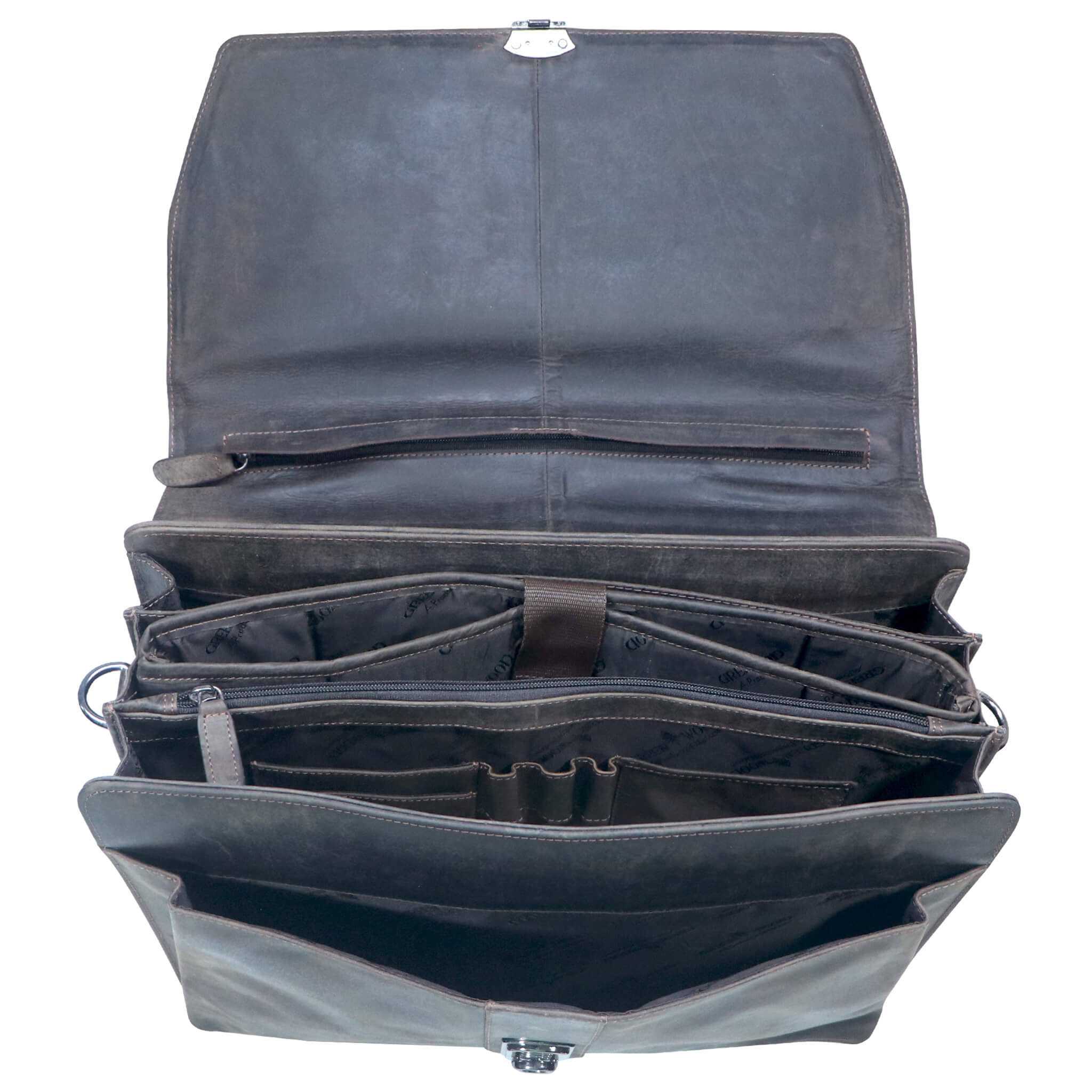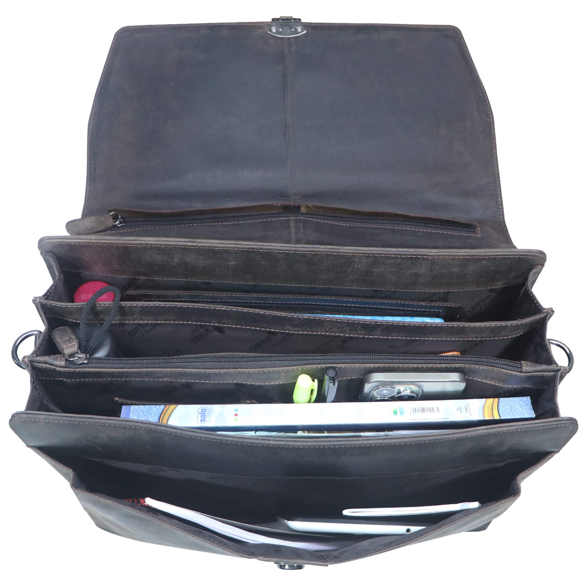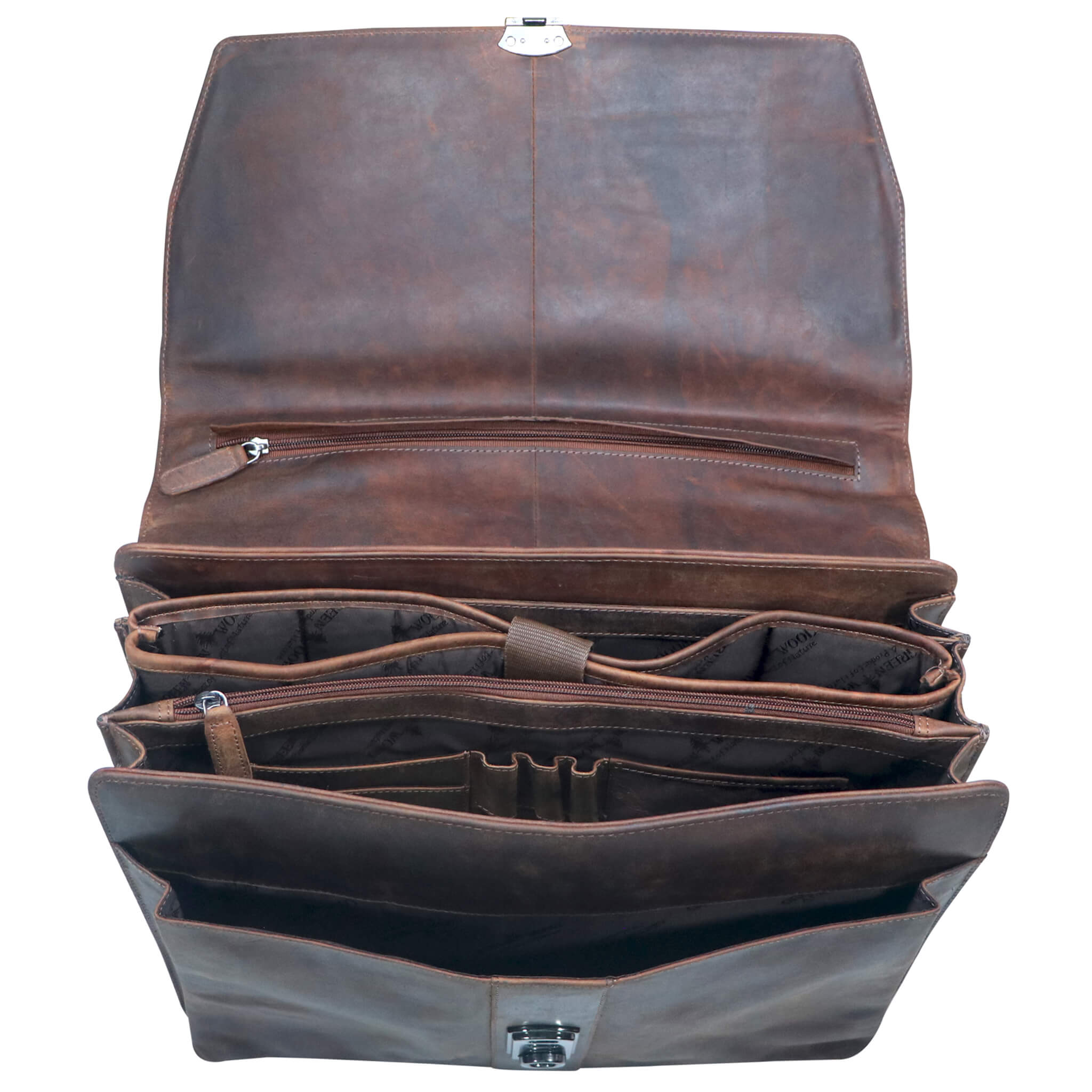 This classic Greenwood briefcase made of genuine leather impresses with its high-quality, robust material and a well-thought-out design. No matter whether it's folders, laptops, books or other utensils - everything finds its perfect place here. Large items such as files or books can be easily stored in the two spacious inner compartments. There is an additional padded compartment, especially for laptops, which offers enough space for devices up to 15.6 inches. Smaller items can be conveniently stored in additional interior zippered compartments and it has business card slots, pen holders and a dedicated pocket for your smart phone. The bag can be carried with ease thanks to a comfortable carrying handle and an individually adjustable shoulder strap. For longer trips there is even a holder on the back for attaching to a trolley. The lock and associated key ensure that your documents are kept safe. With its pragmatic design, this work bag becomes an essential accessory for everyday use.