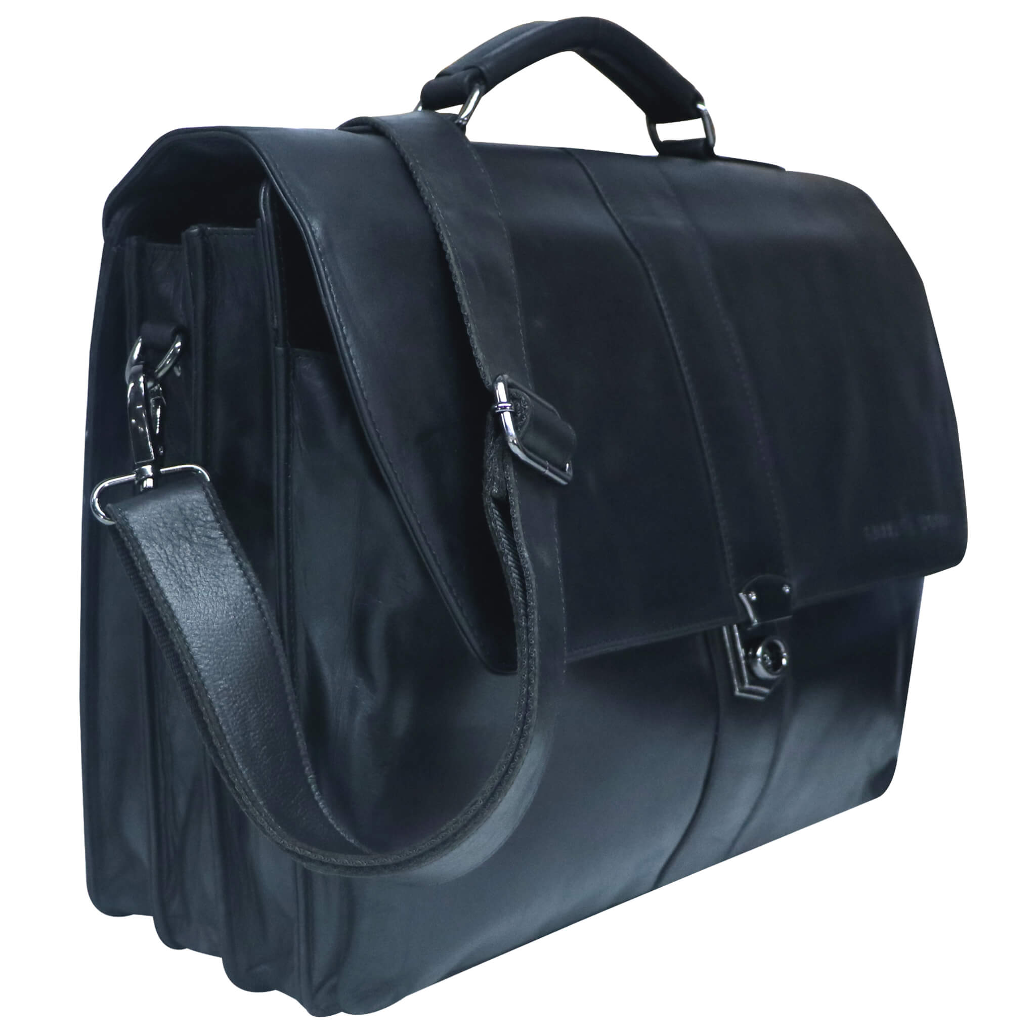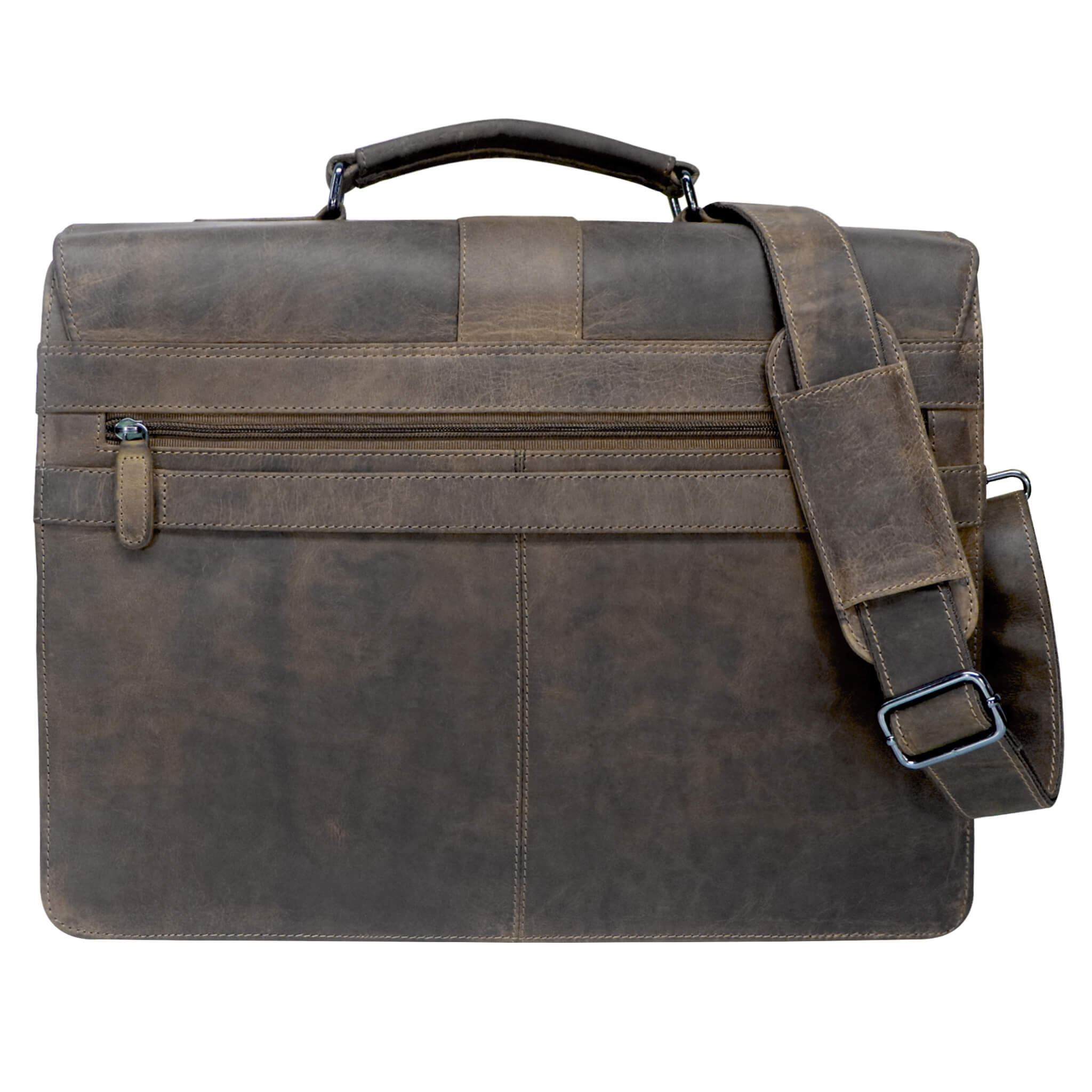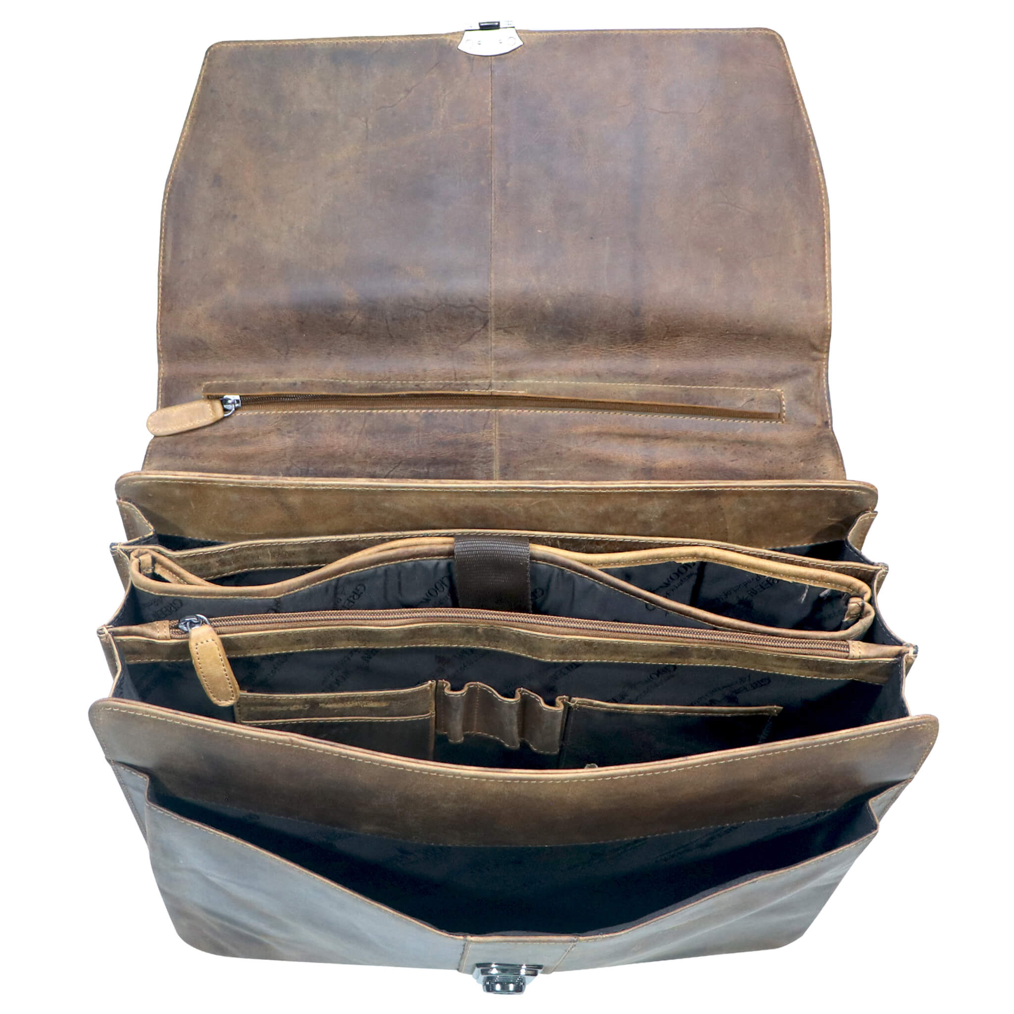 This classic Greenwood briefcase made of genuine leather impresses with its high-quality, robust material and a well-thought-out design. No matter whether it's folders, laptops, books or other utensils - everything finds its perfect place here. Large items such as files or books can be easily stored in the two spacious inner compartments. There is an additional padded compartment, especially for laptops, which offers enough space for devices up to 15.6 inches. Smaller items can be conveniently stored in additional interior zippered compartments and it has business card slots, pen holders and a dedicated pocket for your smart phone. The bag can be carried with ease thanks to a comfortable carrying handle and an individually adjustable shoulder strap. For longer trips there is even a holder on the back for attaching to a trolley. The lock and associated key ensure that your documents are kept safe. With its pragmatic design, this work bag becomes an essential accessory for everyday use.